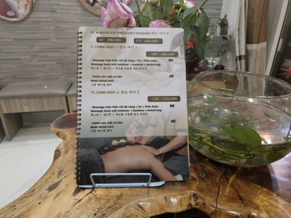 - 핫 스톤 마사지: 이는 다양한 크기의 돌을 사용하여 몸의 일부에 열을 전달하는 기술입니다. 열 치료 기술을 적용하여 휴식과 해독을 촉진하고 건강과 에너지를 향상시킵니다.